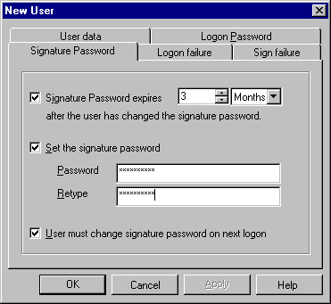 When you create individual users in the User Manager (CmUser program) via the New button in the Users View, define the different settings for the signature password:
