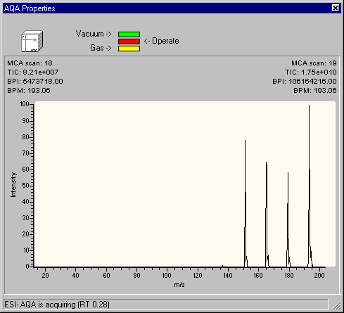 Use the MCA (= Multi-Channel Analysis) mode to calibrate the aQa Mass Spectrometer and analyze pure, low-concentration solutions of substances. Usually, the solution in question is provided to the mass spectrometer via infusion.