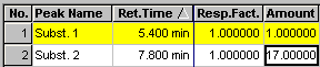 Enter the amount values for the unknown substances contained in the standard sample in the Amount column of the Amount table of the QNT Editor: