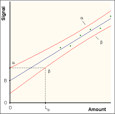 The H-V LOD is derived from selected values of α and β, where α represents the probability of false positives (reporting detection when no analyte is present) and β represents the probability of false negatives (reporting nothing detected when the analyte is actually present). The selected α and β values are used to calculate upper and lower prediction intervals, respectively. Similar to confidence intervals, the prediction intervals are hyperbolic curves bounding the calibration line; they define a region within which a future measurement will have a selected probability of being found.