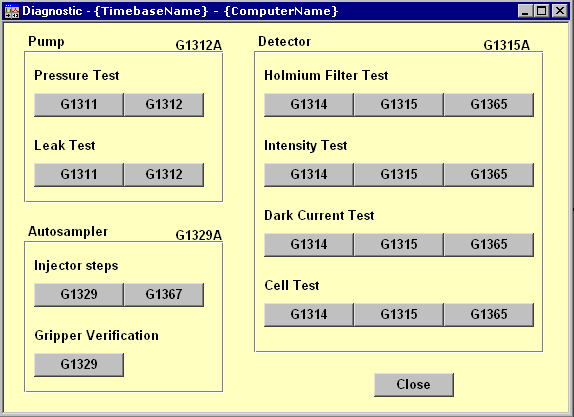 The HP1100.pan and Agilent_1200.pan control panels support several diagnostic functions for the Agilent 1100 and 1200 HPLC systems. Click Diagnostic Functions to open the diagnostic panel. To perform a test, click the related button: