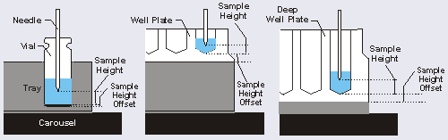 Setting the needle height for (from left to right) a vial, a well plate, and a deep well plate