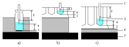 Setting the needle height a) for a standard vial, b) for a normal well plate, and c) for a deep well plate